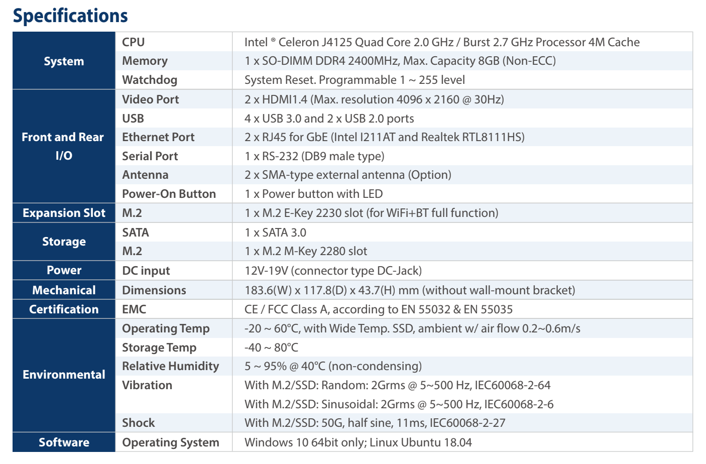 • Onboard Intel ® Celeron J4125 Quad Core 2.7 GHz CPU