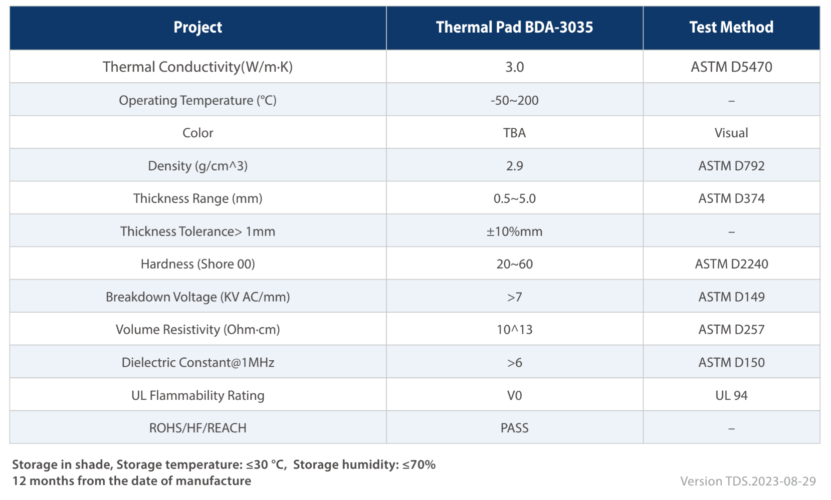 BDA -3035 thermal pad conductive silicone sheet is used to fill the interface of two objects, so that the air from the interface is discharged and the thermal conductivity is improved. The product has self-adhesive, can be die-cut into a variety of shapes, easy assembly. The thermal conductivity is 3.0 W/m. K