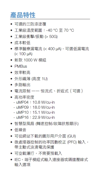 为了进一步丰富雅特生科技的可配置电源产品家族,我们在 750 W - 5000 W 的 MP、iMP 和 iVS 系列电源的基础上,新增了更低功率范围 (400 W - 1,800 W)、 更高功率密度、 高度1U 的uMP (microMP) 系列电源解决方案。新的 uMP 系列电源的成本可媲美非可配置电源,同时还具有市场领先的功率密度、效率、可靠性和安全认证。