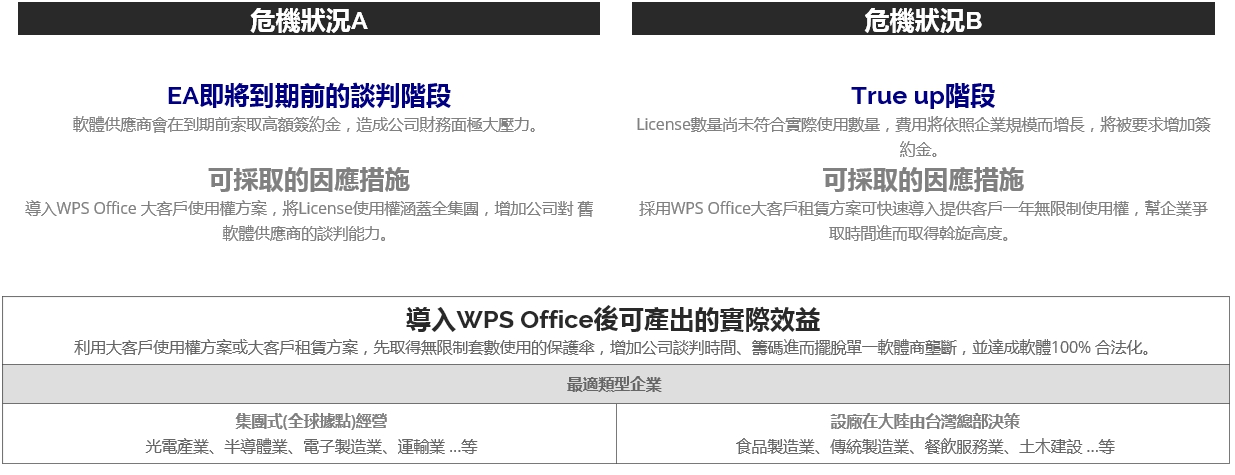 与其他的Office软体相比,WPS Office相容性与主流Office可高达95%, 支援所有办公文件档案格式,可相容.docx/.xlsx/.pptx版本格式,档案格式支援度高达18种,无需担心格式不相容的问题。 Writer(文字)直接支援Adobe PDF浏览功能,节省档案切换的时间。企业在寻找Office替代方案时,经常会以免费Office为优先考量,但免费的Office在企业相容性上未达60%,造成企业导入困难,在相容性上WPS Office 拥有压到性的优势。